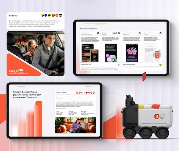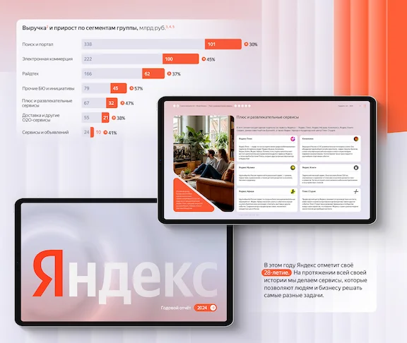 Стратегический отчет занимает практически половину документа и посвящен обзору бизнеса. Лаконичная бизнес модель рассказывает о том, какие ресурсы и активы использует компания для создания и развития собственных сервисов. В работе над данным разделом мы создали визуальную иерархию от экосистемы к конкретному сервису. Каждый бизнес-юнит выделен в отдельную смысловую блок-секцию и имеет схожую структуру, включающую в себя информацию о доле выручки каждого сегмента в выручке Яндекс, обзор рынка каждого из сегментов, конкурентные преимущества, стратегия развития, результаты бизнес-юнита и ключевые нововведения за отчетный год. Каждый сервис дополняют продакт‑скрины (скриншоты продуктов) – наглядно показывают интерфейсы и функционал сервисов Яндекса. Яркие выноски для ключевых операционных показателей – привлекают внимание к самым важным цифрам и фактам. Такой подход создает целостный образ динамично развивающейся экосистемы, где каждый компонент представлен четко и информативно.