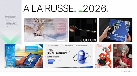 Главная вишенка на торте в этом сезоне стиль, который пронизывает все сферы дизайна и искусства, поднимает культурный код страны. Мы его видим в соцсетях, в музеях, в фильмах, на афишах. Стиль a la Russ работает не только как фолк направление, это стиль про русскую культуру и искусство. Данное направление достаточно сложное в реализации. На слайде мы видим не так много примеров отчетов, которые уже попробовали частично внедрить «русскость» в свои корпоративные материалы. Возможно, через год, мы с вами выделим данное направление в отдельный тренд отчетности.