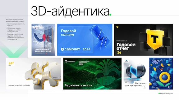 3D-айдентика. На рынке огромное количество 3D-графики. Но в отдельный тренд мы решили вынести 3D-айдентику, которая является мощным маркетинговым инструментом и усиливает узнаваемость бренда. Здесь материалы задают определенный тон коммуникации. Важно отметить, что многие из компаний, которые выбрали этот имиджевый подход, на своих не задают конкретную тематику отчета.