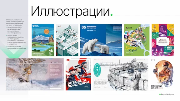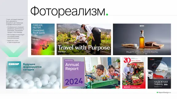 Фотореализм. Стиль, который добавляет документу визуальной достоверности. Здесь важно, чтобы изображение показывали реальную деятельность или продукт компании. При выборе этого стиля важно обратить внимание на единство стиля и цветокоррекции, а также на то, чтобы фотографии не выглядели откровенно рекламными. Человекоцентричность, как тренд, все еще с нами.