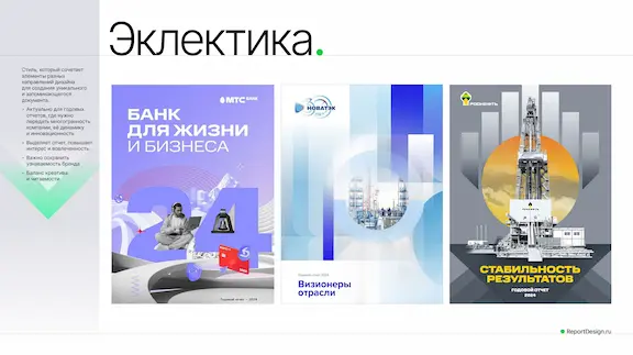 Следующий стиль — эклектика. Его еще называют иногда авангардом. Направление задает уникальный визуальный стиль и повышает запоминаемость документа через сочетание не сочетаемого. Здесь важно не заиграться и сохранить узнаваемость бренда и читаемость отчета.