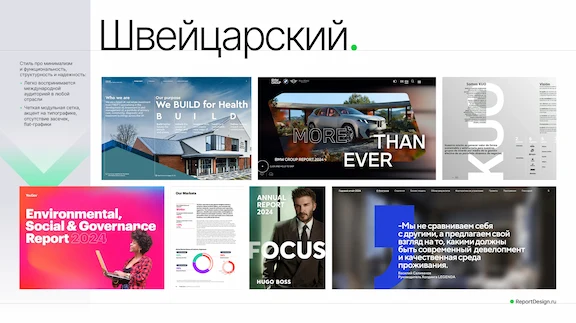 Следующий стиль — бессмертная классика, которой так мало на российском рынке, но которая очень понятна и популярна у международной аудитории. И это швейцарский стиль. Если вы планируете выход на другие рынки, рассмотрите это направление. Здесь про четкую модульную сетку, отсутствие засечек в шрифтах и яркую коммуникацию.