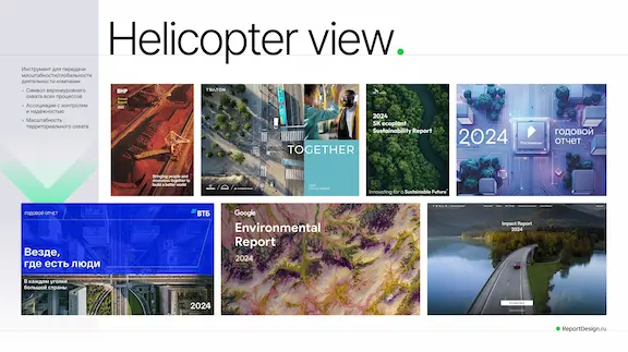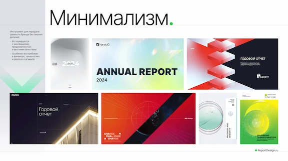 В текущем году мы видим активный переход от книжной ориентации в экранную или альбомную. Данный тренд набирает оборот, так как чтение отчетов переходят в онлайн формат, при этом такие отчеты просты в адаптации под веб интерфейс или корпоративные презентации.