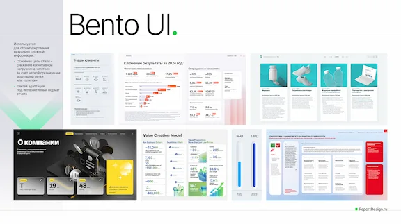 Bento UI. Его крайне сложно отследить в обложках отчетов, поэтому здесь приведены примеры различной верстки. Основная цель стиля — снижение когнитивной нагрузки на читателя при изучении сложной отчетной информации. Вся верстка состоит из «плиток», в которых расположена емкая информация. Этот стиль легко адаптируется под веб-интерфейс.