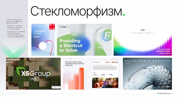 Стиль стекломорфизм с нами уже несколько сезонов и уходить, в целом, не планирует. Если раньше в этом стиле мы видели обилие стеклянных графиков, различных смысловых элементов с фактурой стекла, то сейчас стекло становится матовым или рифленым, добавляя объема и ощущения технологичности. Данный стиль популярен в компаниях, которые делают ставку на цифровизацию процессов. Мы предполагаем, что в следующем сезоне стекломорфизм начнет уходить на второй план и станет более утилитарным.
